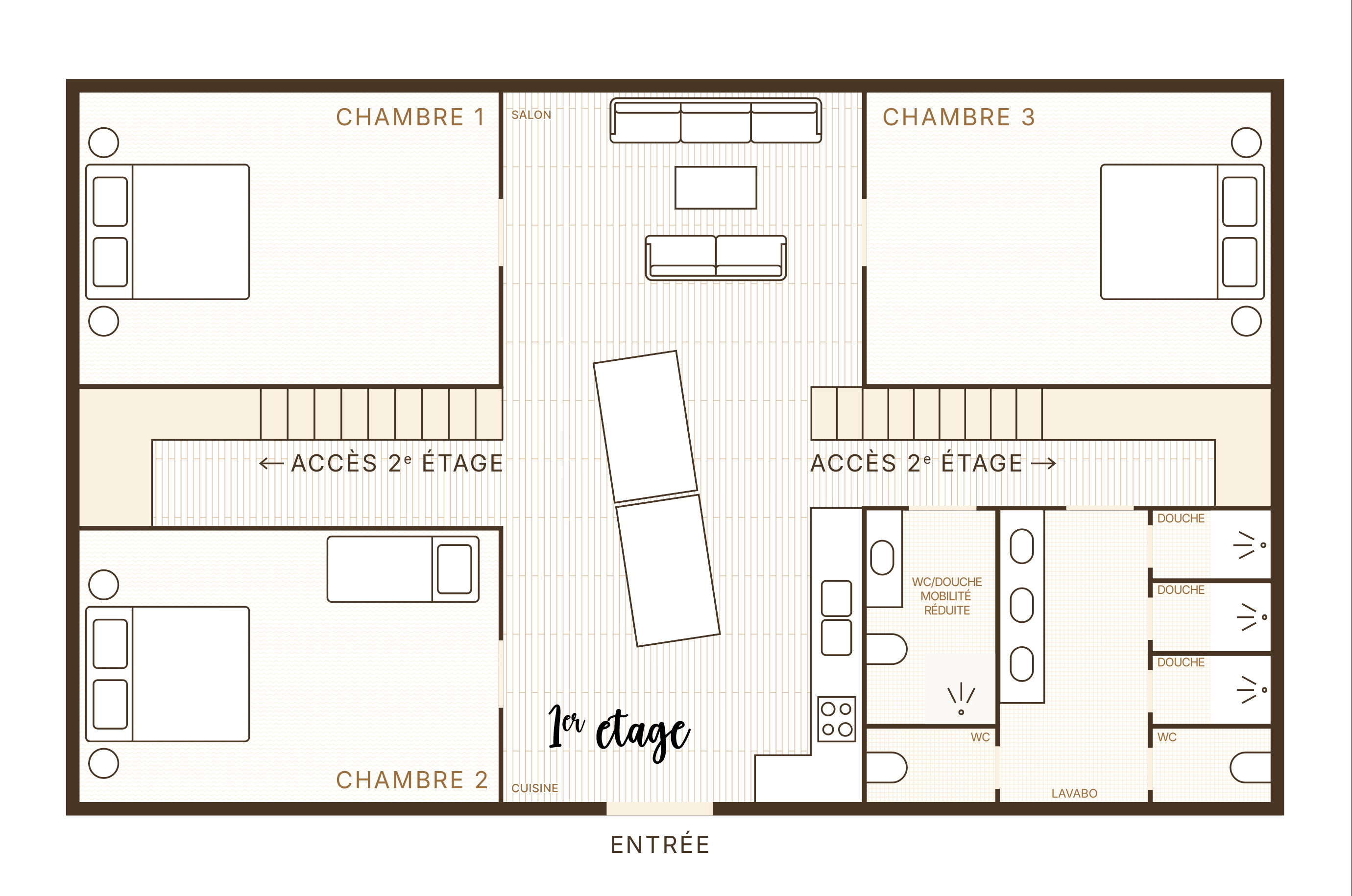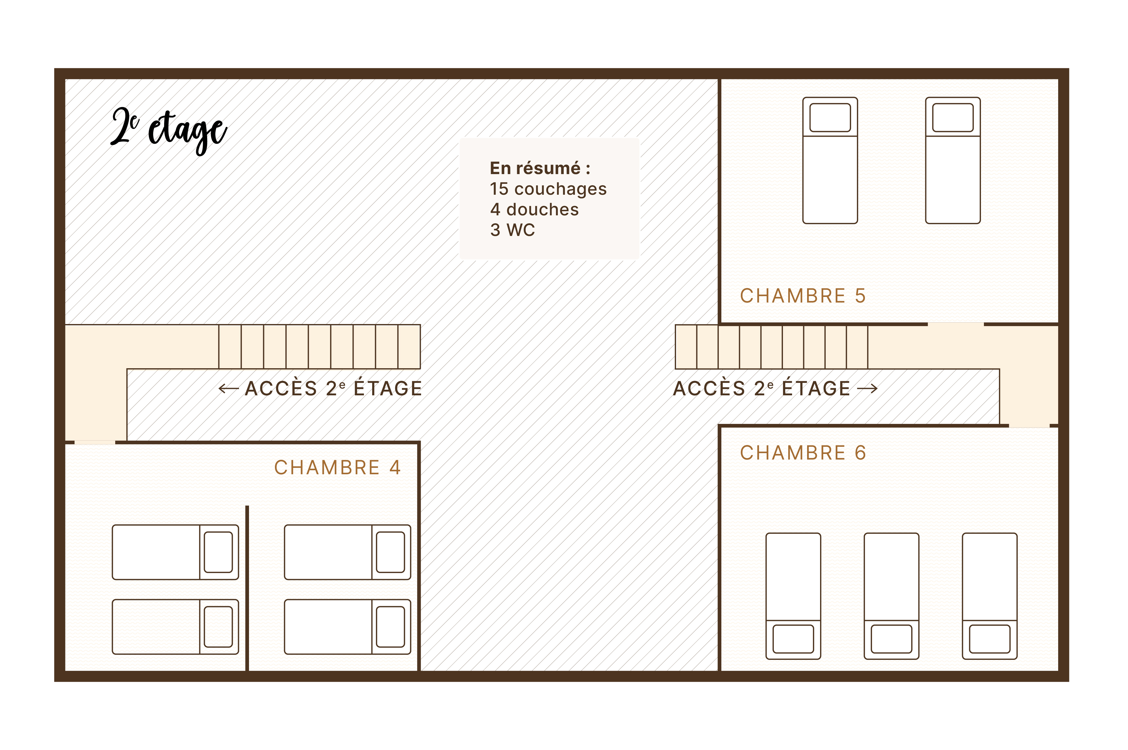 Au rez-de-chaussée il y a trois chambres spacieuses, décorées avec goût, toutes équipées de lits doubles. À l’étage des Greniers du Meix Lagor, on trouve trois autres chambres où sont installés des lits simples. Ces chambres sont idéales pour les enfants. Pour eux ce lieu inspirant est une fabrique à souvenirs.